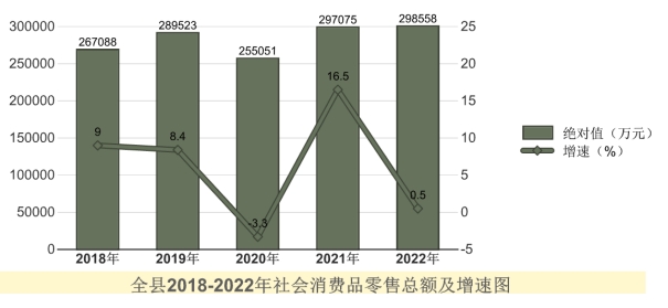全年全縣社會消費品零售總額29.86億元,同比增長0.5%。按經(jīng)營地統(tǒng)計,城鎮(zhèn)消費品零售額18.20億元,同比增長3.1%;鄉(xiāng)村消費品零售額11.65億元,同比下降3.3%。按消費形態(tài)統(tǒng)計,餐飲收入1.71億元,同比下降1.3%;商品零售28.15億元,同比增長0.6%。