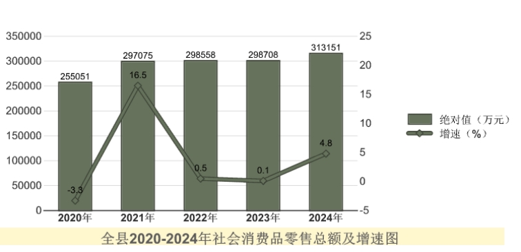 全年全縣社會(huì)消費(fèi)品零售總額31.32億元,同比增長(zhǎng)4.8%。按經(jīng)營(yíng)地統(tǒng)計(jì),城鎮(zhèn)消費(fèi)品零售額18.67億元,同比增長(zhǎng)3.4%;鄉(xiāng)村消費(fèi)品零售額12.64億元,同比增長(zhǎng)7.0%。按消費(fèi)形態(tài)統(tǒng)計(jì),餐飲收入1.9億元,同比增長(zhǎng)8.7%;商品零售29.38億元,同比增長(zhǎng)4.6%。