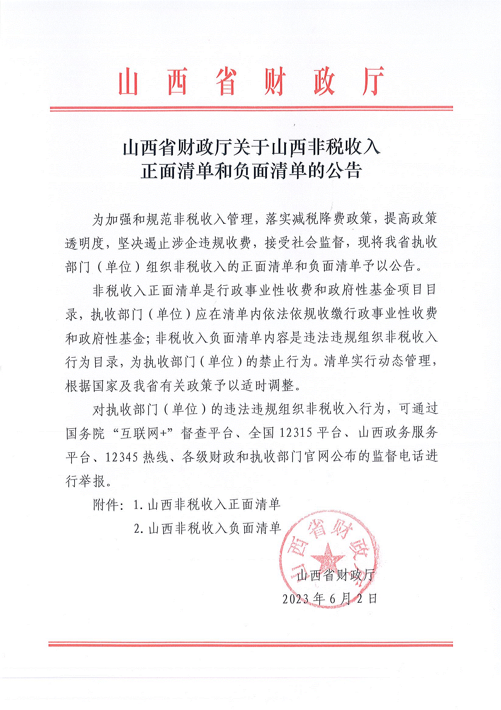 山西省財(cái)政廳關(guān)于山西非稅收入正面清單和負(fù)面清單的公告