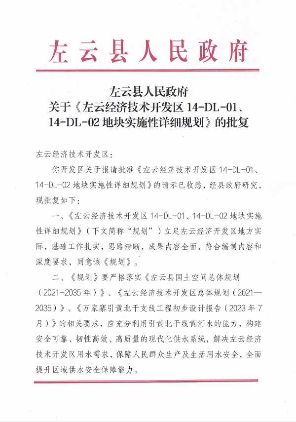 左云縣人民政府關于《左云經(jīng)濟技術開發(fā)區(qū)14-DL-01、14-DL-02地塊實施性詳細規(guī)劃》的批復